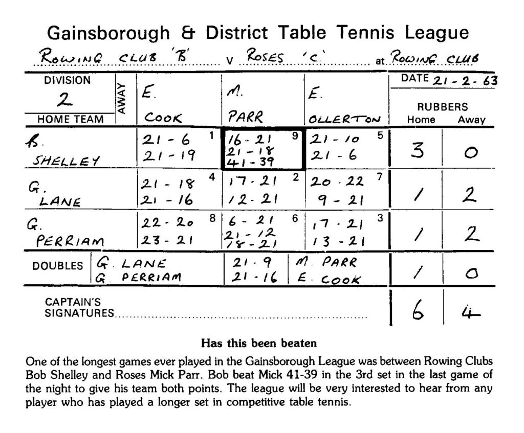 Ken wrote: “The feat was copied and published in a souvenir handbook, commemorating the Golden Jubilee of the Gainsborough and District Table Tennis League back in 1987/88. I believe that the winner has sadly passed on, but the loser is 78 and worked with me at the local power station.”