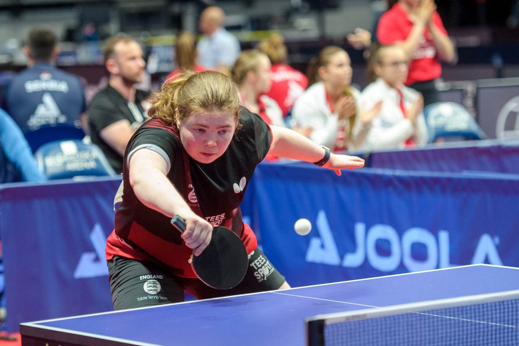 England Junior Girls (Mari Baldwin, Jasmin Wong, Anaya Patel, Amy Marriott) started the play-offs with a 3-2 win over Hungary, Wong notching a double including a comeback 3-2 (9-11, 10-12, 11-8, 11-8, 11-7) win over Irisz Laskai to seal victory after England had trailed 1-0 and 2-1.