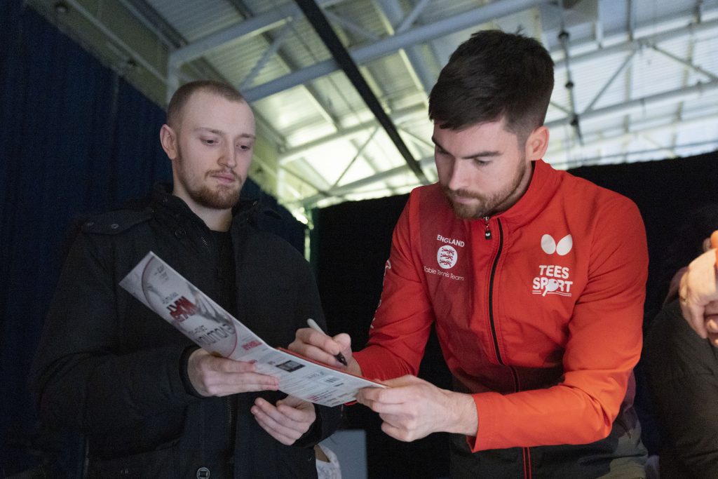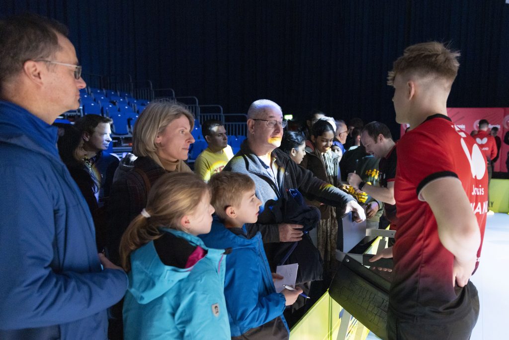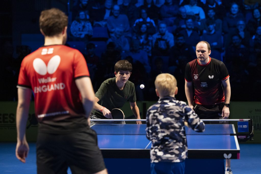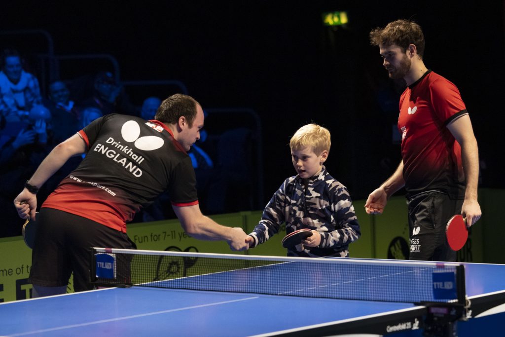 For two young fans, England’s European Team Championships match in Crawley turned into a very special experience as they ended up playing doubles with Paul Drinkhall and Sam Walker.