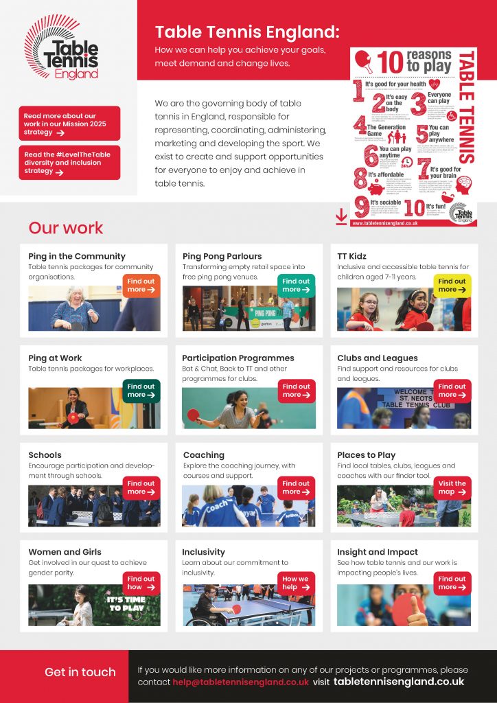 The work we conduct across the company ensures we create and support opportunities for everyone to enjoy and achieve in table tennis. You can see an overview of our work below: