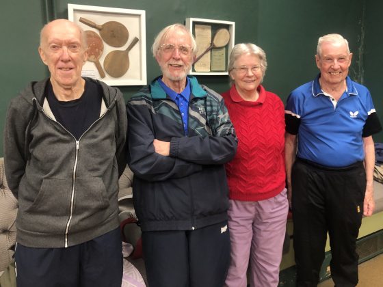 With an aggregate age of over 330 years, the C team from Aftermath TTC have just won their Divisional Cup and finished as runners-up in Division Four of the Guildford Table Tennis League, Surrey’s largest league. The average age of the four person squad is 82.5 years old and all having been playing the sport in a competitive sense for fifty years or more.