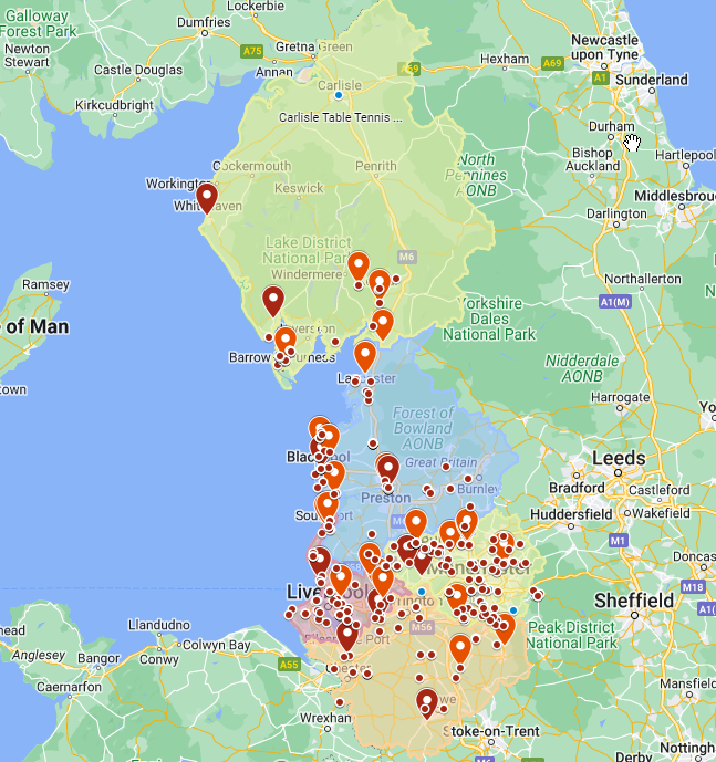 Click on the map below to see the following information in the North West (July 2023), select the legend items to hide/show categories and click on the pins for further details of each item.