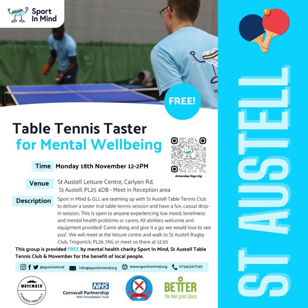 At one of the St Austell Table Tennis for Good events I met with Laura Brooks of Sport in Mind to look at the potential for running Table Tennis specific sessions and linking to the club. There are already regular sessions in Penzance and Plymouth using Table Tennis to support men’s mental health.