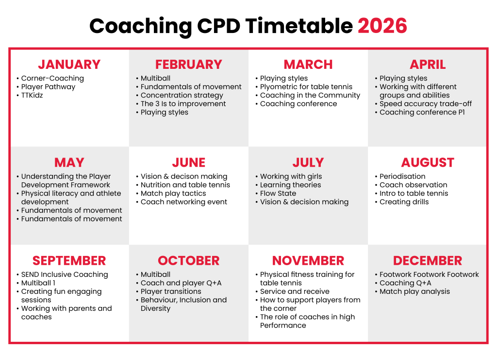 Table Tennis England’s role-based pathway of three distinct qualifications is supplemented by a multitude of CPD opportunities, making it easier for coaches to continue to develop themselves in order to develop their players.