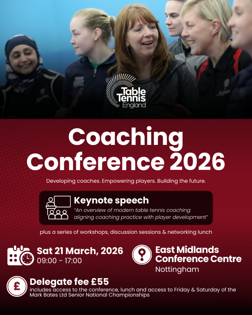 As part of Table Tennis England’s commitment to coaches and coach development, the first ever full Table Tennis England Coaching Conference will take place in Nottingham on Saturday 21 March 2026