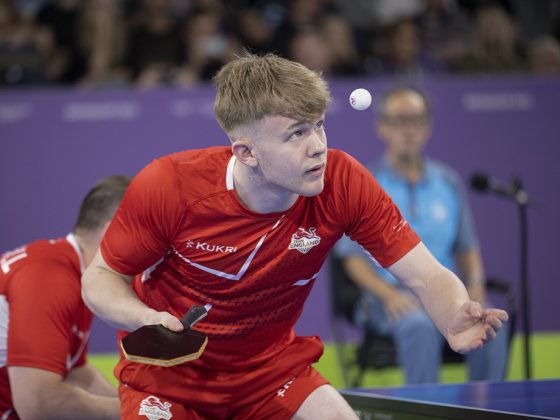 England began their campaign against Guyana, the combination of Paul Drinkhall & Tom Jarvis (pictured above, picture by Michael Loveder), not a commonly-used line-up, gelled as if they had been playing together for years, the pair simply having too much of everything for their opponents Christopher Franklin & Joel Alleyne.