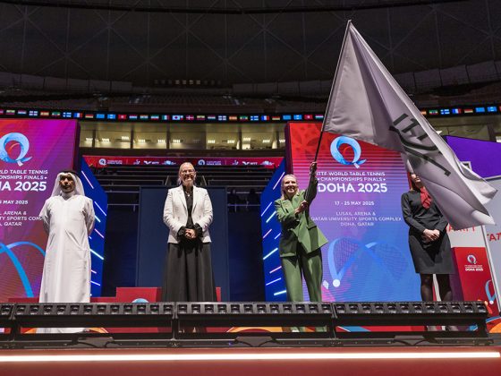“At the end of the championships, the ITTF flag was passed on from the Qatar Table Tennis Association via Petra Sörling, ITTF President, to me as Chair – on behalf of all the members of Table Tennis England – signifying taking on the responsibility of hosts of the next World Championships in London.