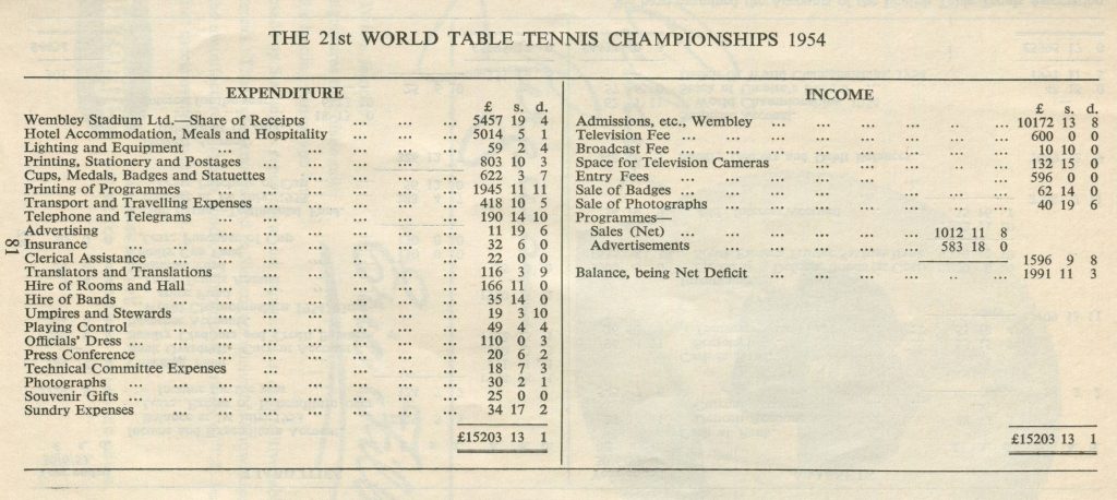 By 1938/39 there were 39 Open Championships in England, a duplicator was bought for £15 and for those who remember stamp duty on cheques, it cost the Association £3 17s 8d. Other expenditure included £2 to affiliate to the ITTF, total income from affiliation fees amounted to £676 12s 6d.