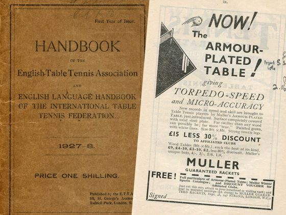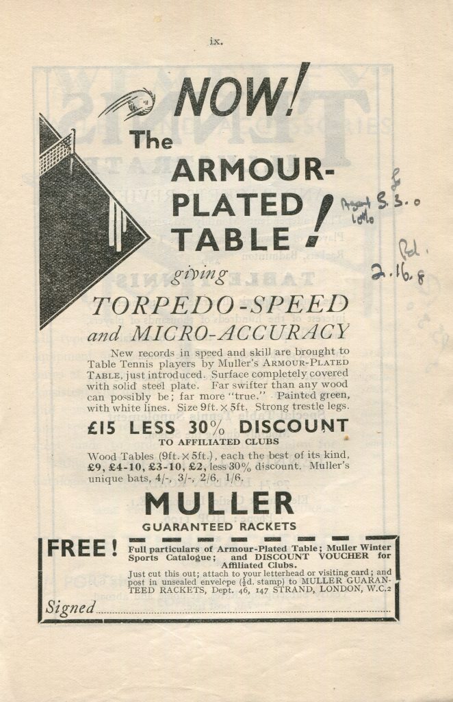 As the Association expanded, so too did the handbook, and there was more on Local Leagues which included their clubs and secretaries, as well as reports by the ETTA President, Chairman and Treasurer plus annual accounts. In 1934/35 there is reference to the first Women’s Committee with sections in the north and south, you could buy a dozen Barna table tennis balls for 4/- and a Barna bat for 5/-. Or you could get an armour-plated table with the surface completely covered with solid steel plate!