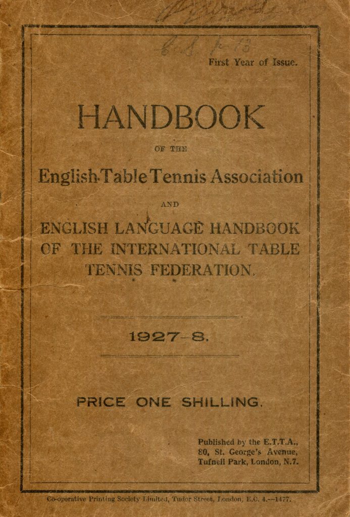 The first handbook is described as ‘Handbook of the English Table Tennis Association and English Language Handbook of the International Table Tennis Federation’, costing 1/-, the equivalent of five pence. It contained details of ETTA officials and members, affiliated leagues and bodies, a brief history and the constitution, ETTA Laws, details of players who had represented England plus records of sanctioned Open Tournaments. The ITTF section also has some interesting information, especially the section on alternative laws using the lawn tennis scoring system.