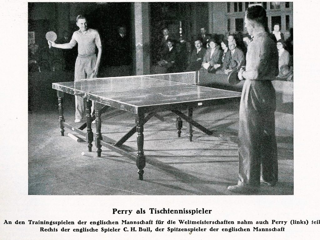 Playing both table tennis and tennis, it was early in 1930 that Perry’s lawn tennis prowess came to the fore and he was selected for the Davis Cup team in 1931. During one week he played lawn tennis for his London team against Paris in Paris and then switched to playing in an international table tennis tournament, winning the Coupe de Noel against a very strong field. Shortly after, Perry concentrated solely on lawn tennis going on to win eight grand slams including three Wimbledon titles in 1934, 1935 and 1936. He last played table tennis in 1932.