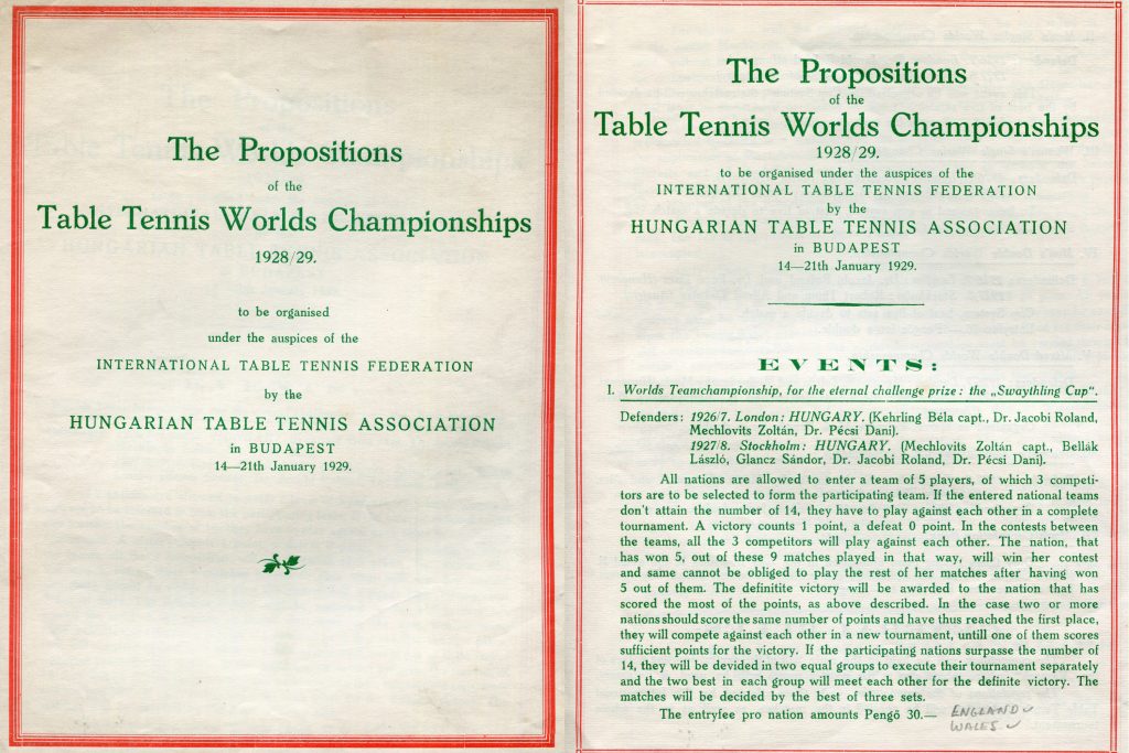 Propositions at the World Championships in Budapest were printed in English and Hungarian and set out the regulations for the tournament. The competition was played “in the main hall of the central sporting palace of the “Vasasok” where tables also in the smaller rooms will be used, if necessary”. The jury was made up of one representative from each national association who had players who entered.