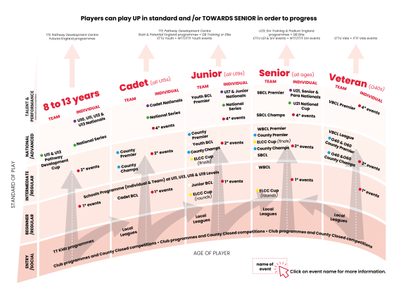 It details each stage of a player’s development from entry level up to the talent & performance space – and how each stage matches up to appropriate competitions, from local leagues to 1* tournaments and onwards to 2*, County Championships, British Clubs Leagues and beyond to pinnacle national and then international events.