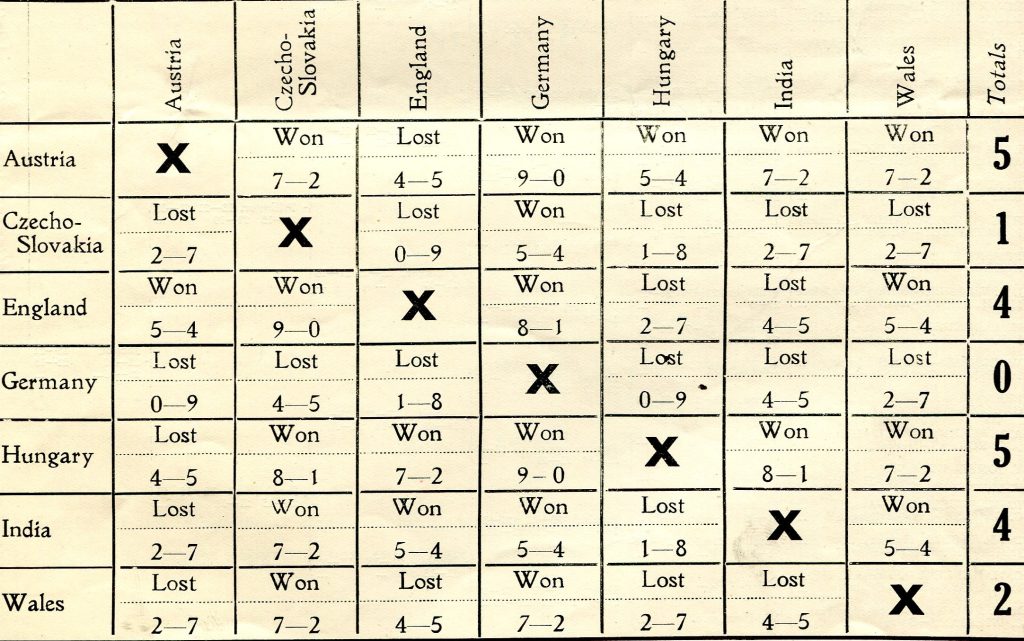 The results table at the end of all matches was five points for Austria and Hungary with Austria losing to England and Hungary losing to Austria. England and India both ended with four wins, Wales two, Czechoslovakia one, whilst Germany lost all their matches.