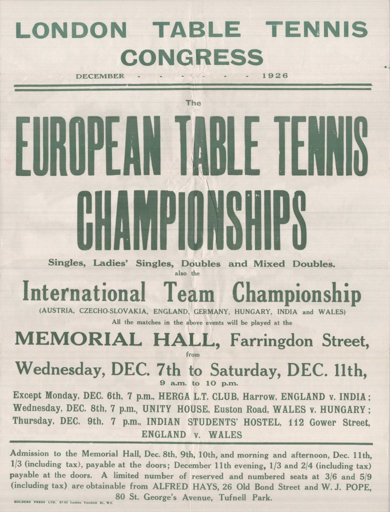 The year 1926 was a momentous one in the history of international table tennis. Triple events were planned in December 1926 in London – the International Table Tennis Federation (ITTF) Conference, a tournament entitled The European Championships and an International Team Championship tournament.
