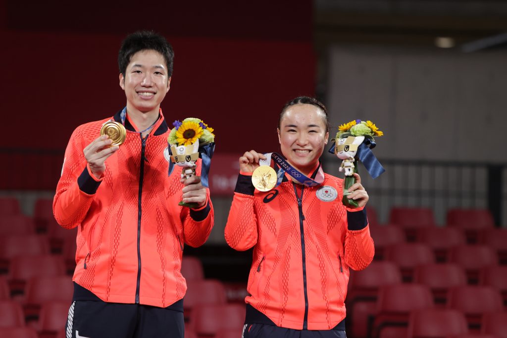 Mima Ito on top of the podium with Jun Mizutani at Tokyo 2020