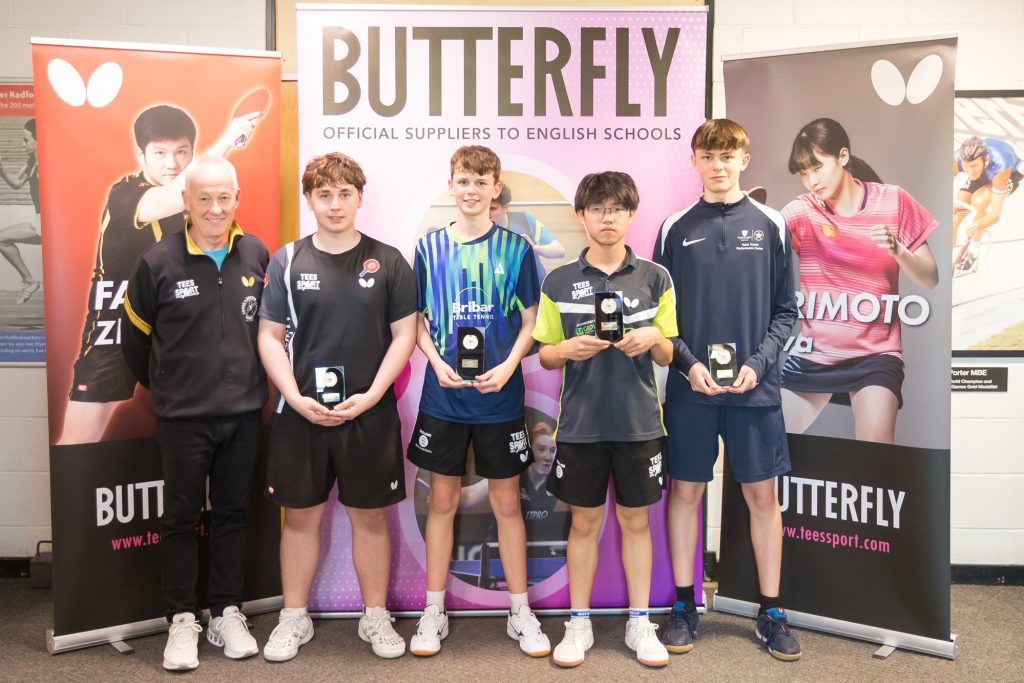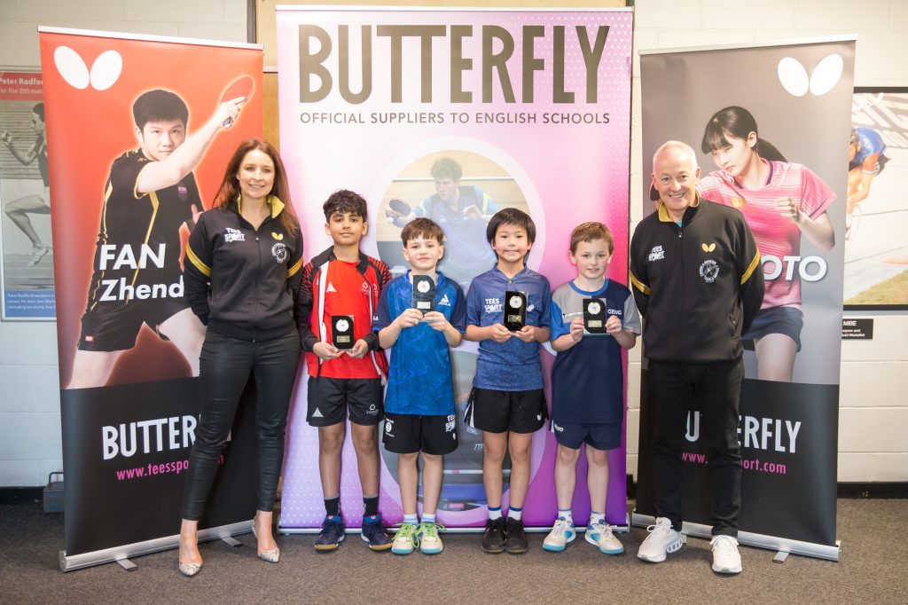 The Under-11 Boys medallists with Butterfly ambassadors Nicola Deaton (left) and Alan Cooke (right)