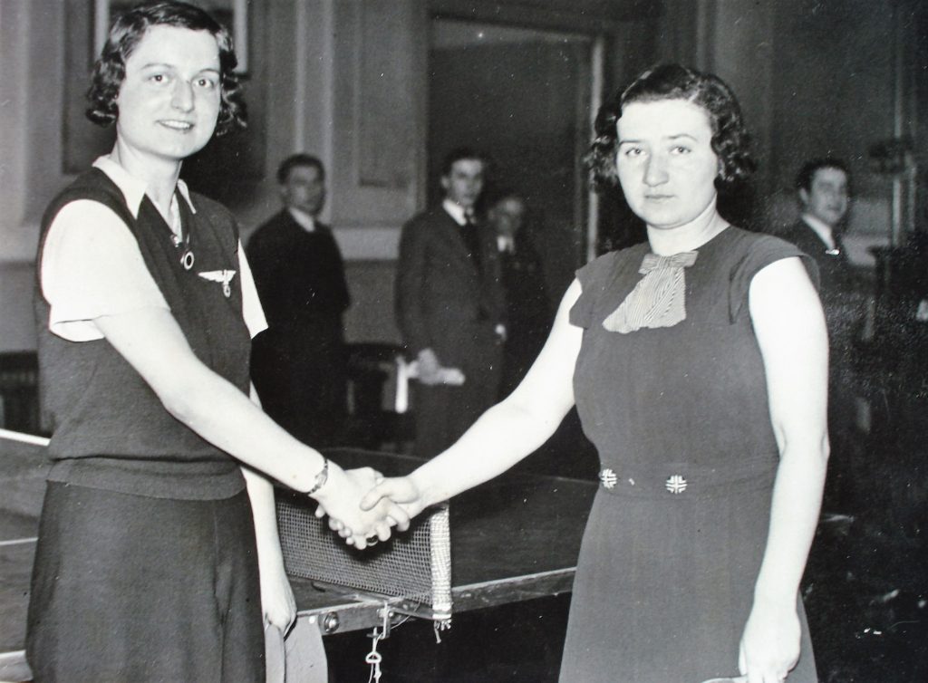 Dora caused a sensation in 1937 when she turned up to play in trousers rather than a skirt, unheard of at the time. In 1939 J W A Connelly in Table Tennis said of Dora: “I noticed from high up in the Wembley press box how beautifully she positions for every stroke, how near to perfect is her footwork, and the ease with which every stroke is carried out”.