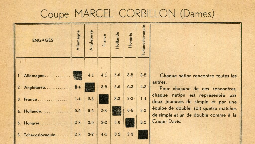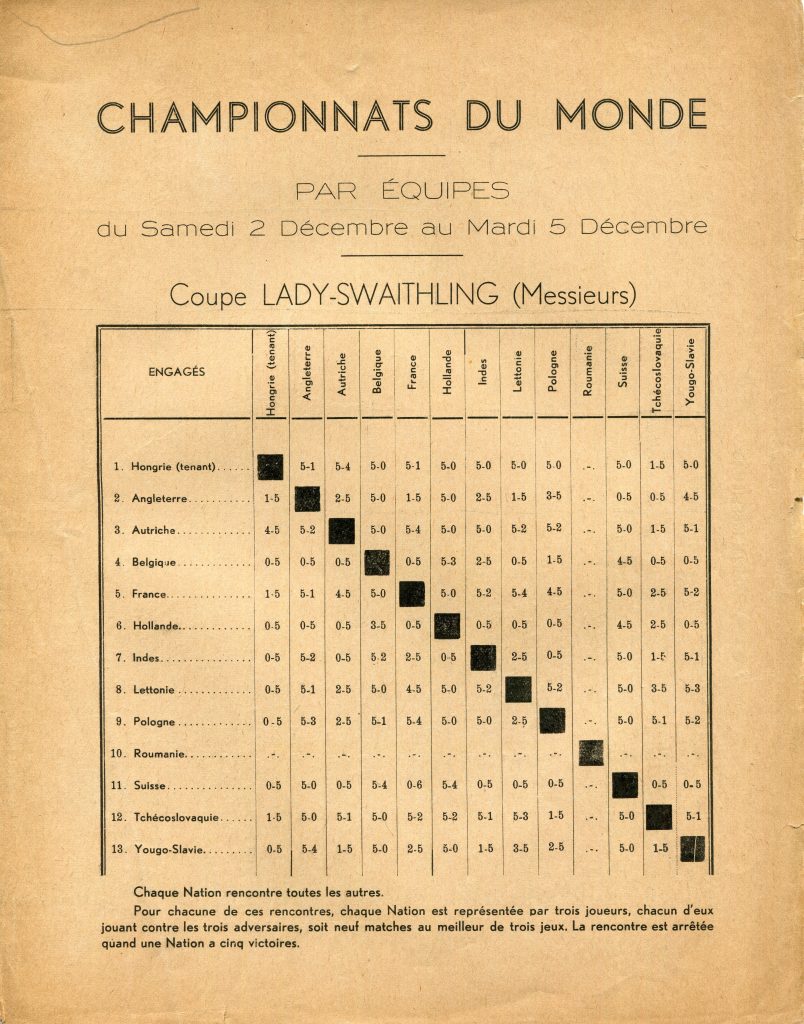 The England teams were selected following trials and at last it could be said ‘teams’, as for the first time there was a Women’s Team event. Dora Emdin, Nora Norrish, Margaret Osborne and Wendy Woodhead made up that first England Women’s World Championships team. Corti Woodcock accompanied the players to Paris as non-playing captain for both the men and women’s teams where there were four days of play for the team events from 2-5 December. Then, a rest day on the 6th before the individual events started on 7 December.