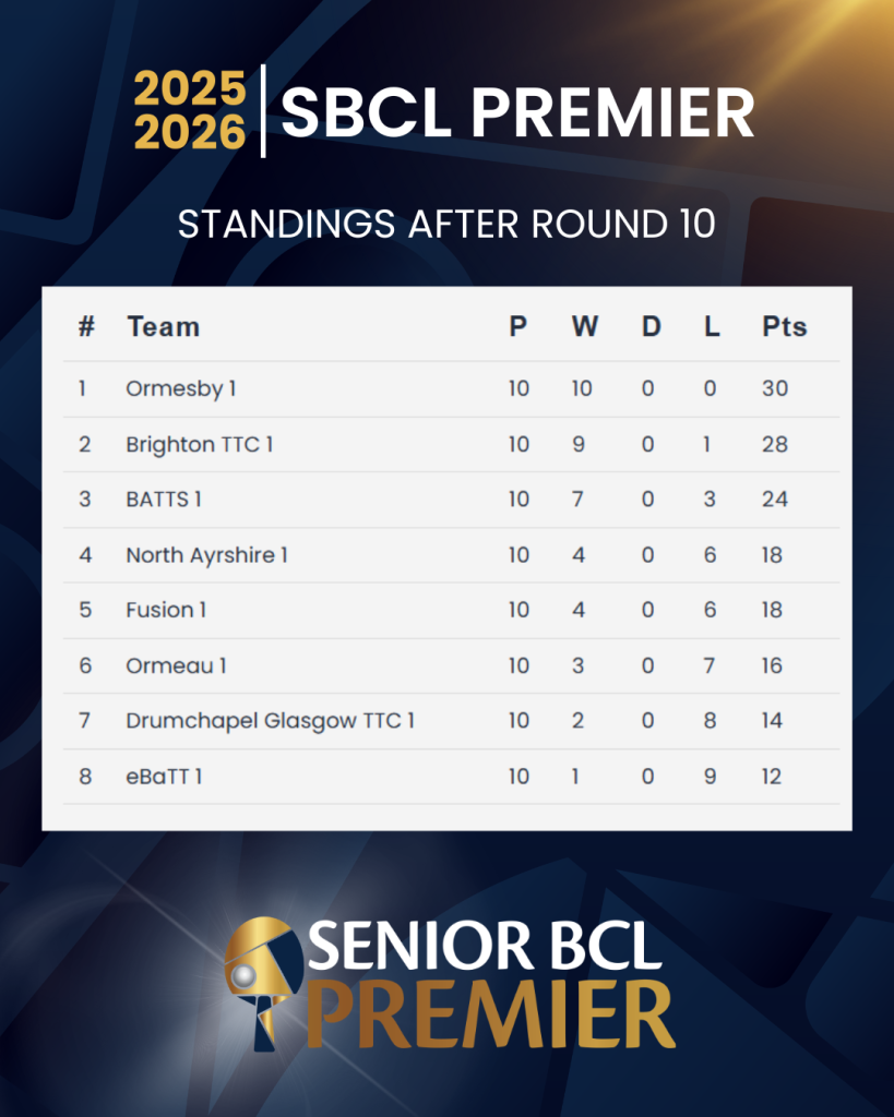 Meanwhile, North Ayrshire TTC and Fusion TTC sit in the middle of the table but are far from safe mathematically. North Ayrshire’s impressive victory over BATTS has lifted them into the top four, yet the congested standings mean they cannot afford any slip-ups.