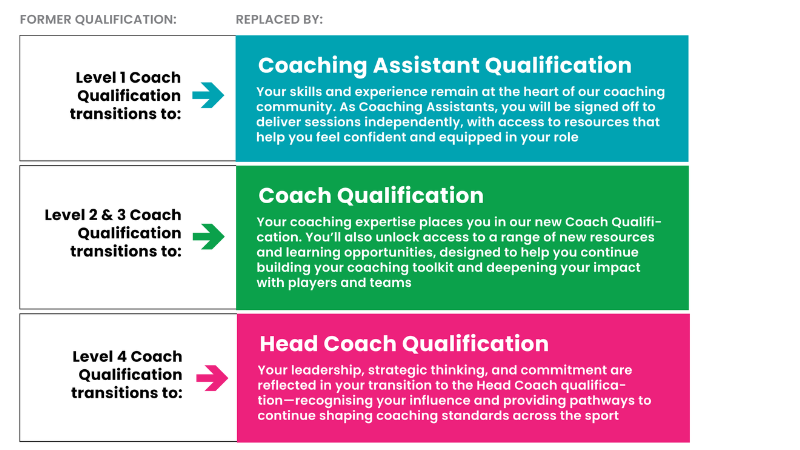 Level 1 Coaches will become Coaching Assistants (Accredited and recognised to deliver sessions independently), Level 2 and 3 Coaches will be translated to the Coach qualification, whilst Level 4 Coaches will become Head Coaches.