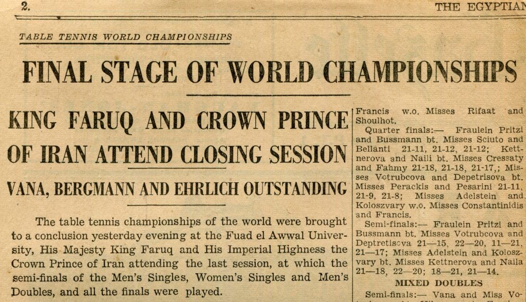 Czechoslovakia’s team of Vlasta Depetrisova, Marie Kettnerova and Vera Votrubcova were second with their one loss to Germany. Romania also had two players, Angelica Adelstein and Sari Kolosvary, and finished third, leaving home nation Egypt fourth and Palestine fifth.