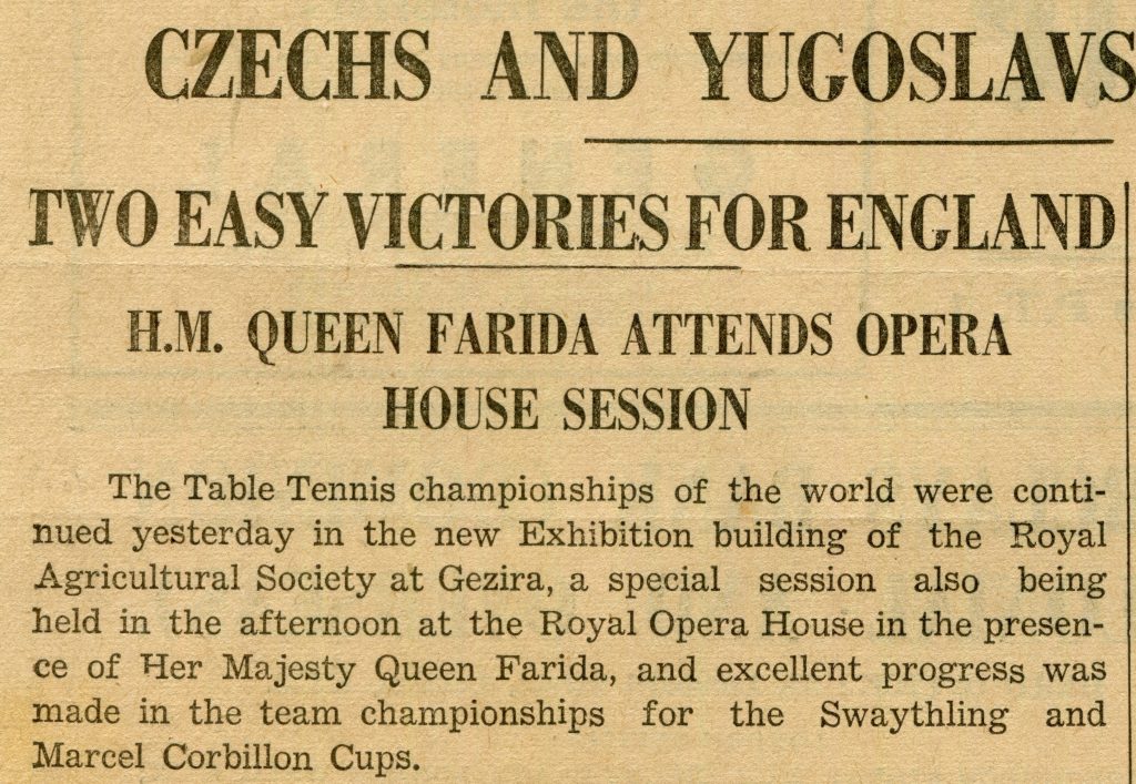 Later matches were played at the Exhibition Hall of Foudavag University, Heliopolis on the outskirts of Cairo, later still matches were played at the Royal Opera House in Cairo and at one session all the female players were presented to the Queen. Both the King and Queen of Egypt watched the play, the first time a reigning monarch had done so. King Farouk donated the Egypt Cup which was presented to the country who were to host the next World Championships.