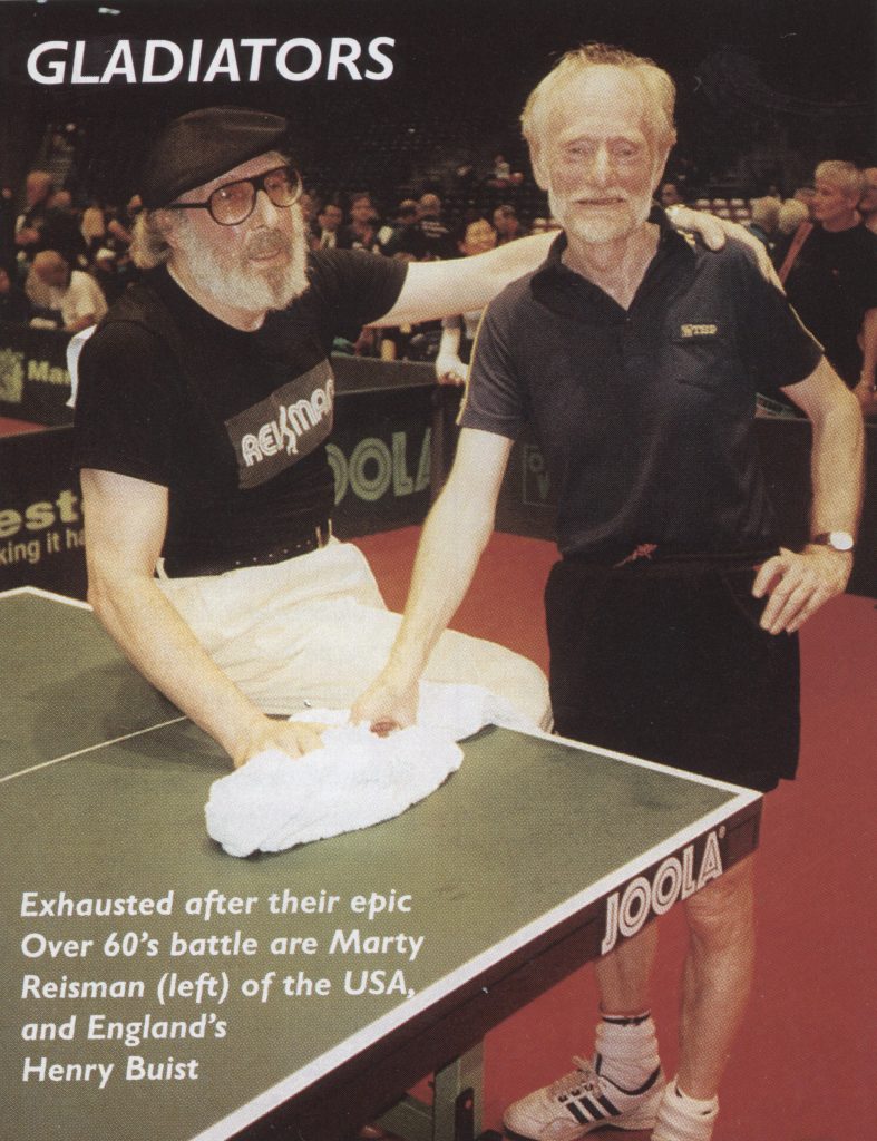 He competed at the World Veteran Championships in Manchester in 1998, and was featured in the Table Tennis News report of the championships, photographed alongside one of his opponents, England’s Henry Buist. The pair were described as having played a hardbat “epic”.