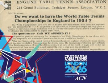 As the ITTF World Team Table Tennis Championships Finals London 2026 Presented by ACN returns to OVO Arena Wembley this month, a fascinating letter has been discovered shedding light on how the last Wembley Championships may have been funded.