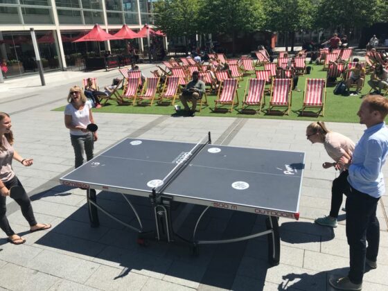The tables are currently unavailable. Updates will be posted here. Two tables are normally located outside John Lewis or in Queens Court. Bats and balls can be requested from the Customer Service Centre if they’re missing from the table.