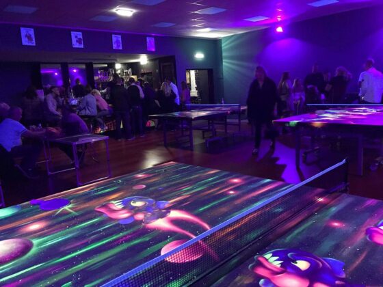 UV table tennis tables that glow in the dark alongside a bar. Over 18’s only.