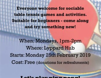 Table available on Mondays, 1pm-2pm, at our Ping @ the Hub sessions, where bats and balls are provided. Social group with games and activities suitable... Continue reading