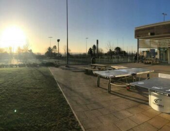 Two outdoor tables located near the Grandstand Cafe at Marjons Sport
