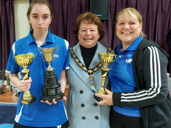Ladies Singles’ champion Alesha Ellis-Austin (left) and runner-up Dawn Baldry (right) receiving their trophies from the Mayoress, Jackie Galley