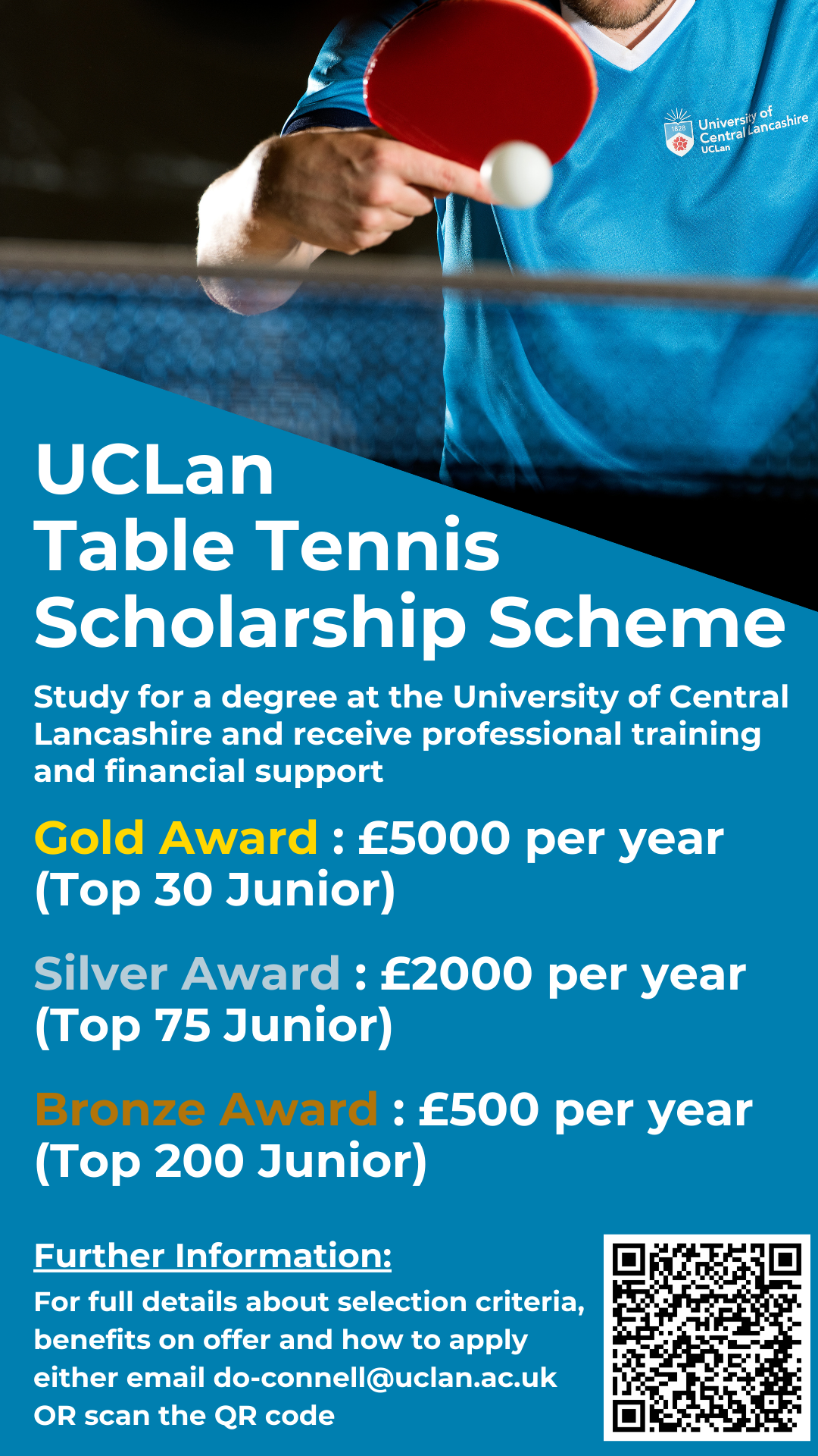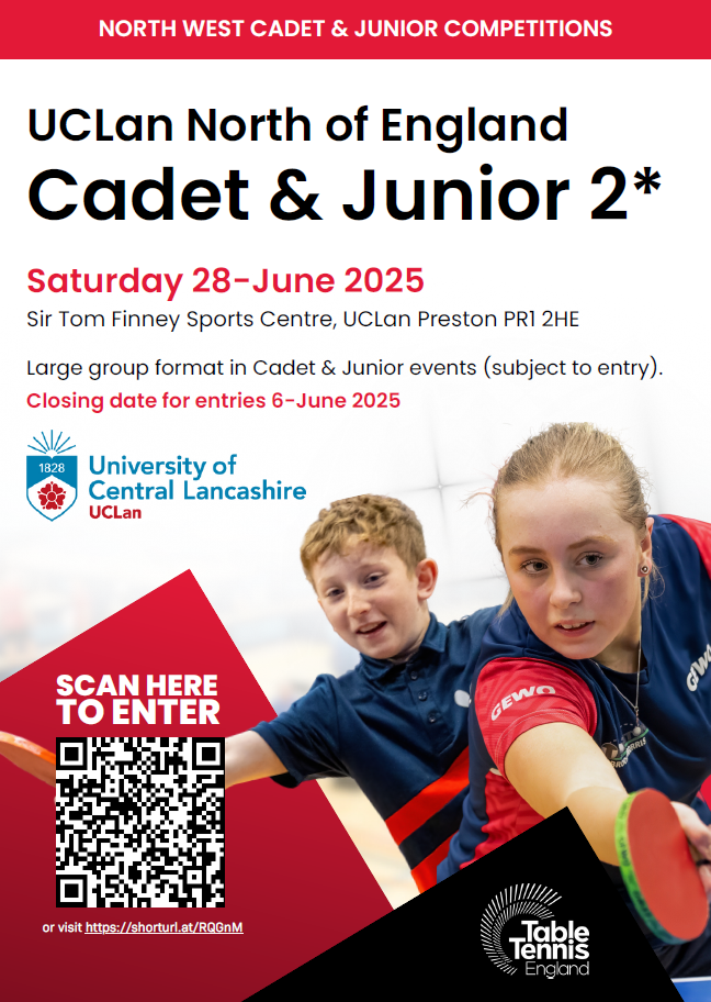 We are delighted to announce a new Cadet & Junior 2★ Open competition in the North West taking place at Sir Tom Finney Sports Centre on Saturday 28th June 2025 (CD 6/6/25), supported by the University of Central Lancashire in Preston, who provide excellent training, competitive opportunities and table tennis scolarships. The competition is aimed at Cadet U15 (born 2010 or later) & Junior U19 (born 2006 or later) players in the North of England and aims to provide appropriate competitive playing opportunities for all aspiring young players.